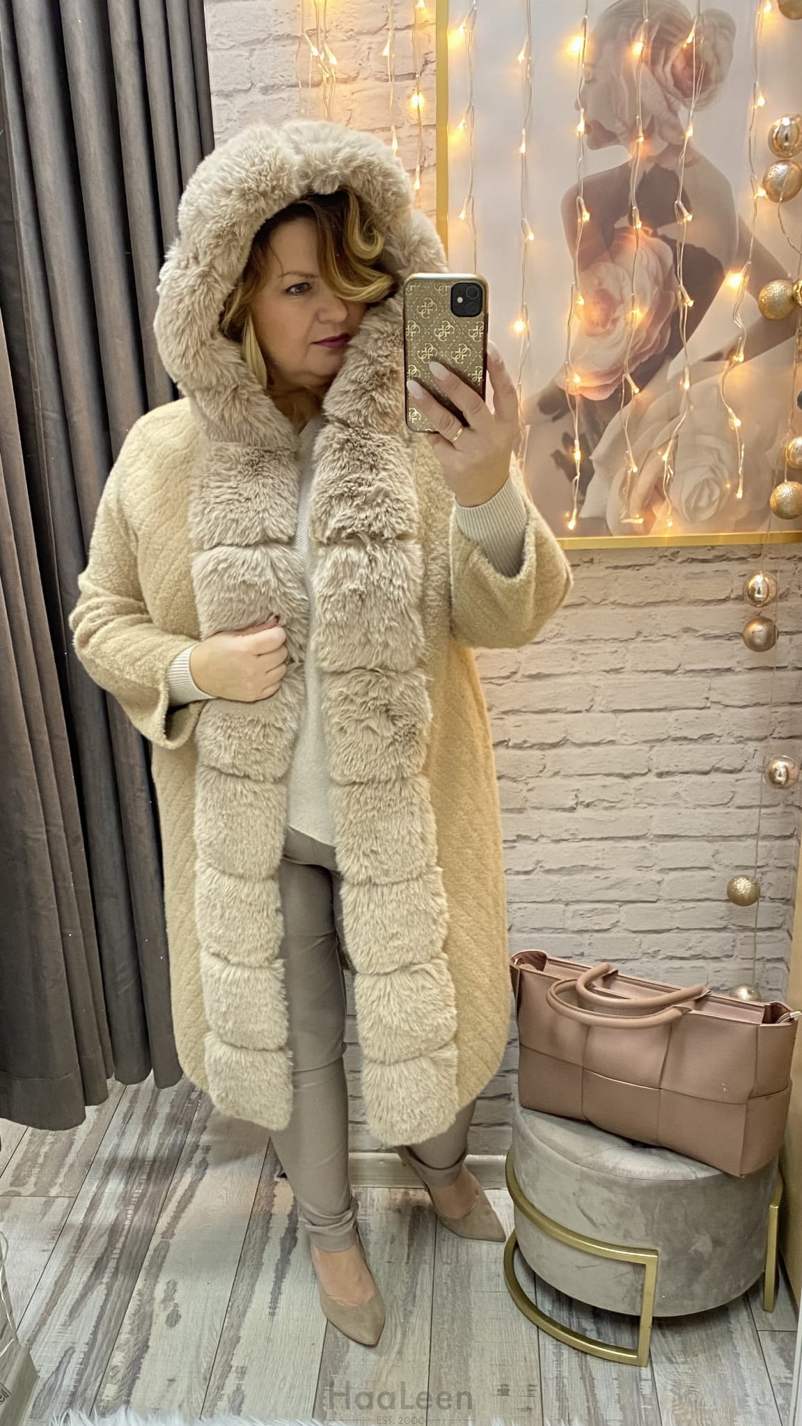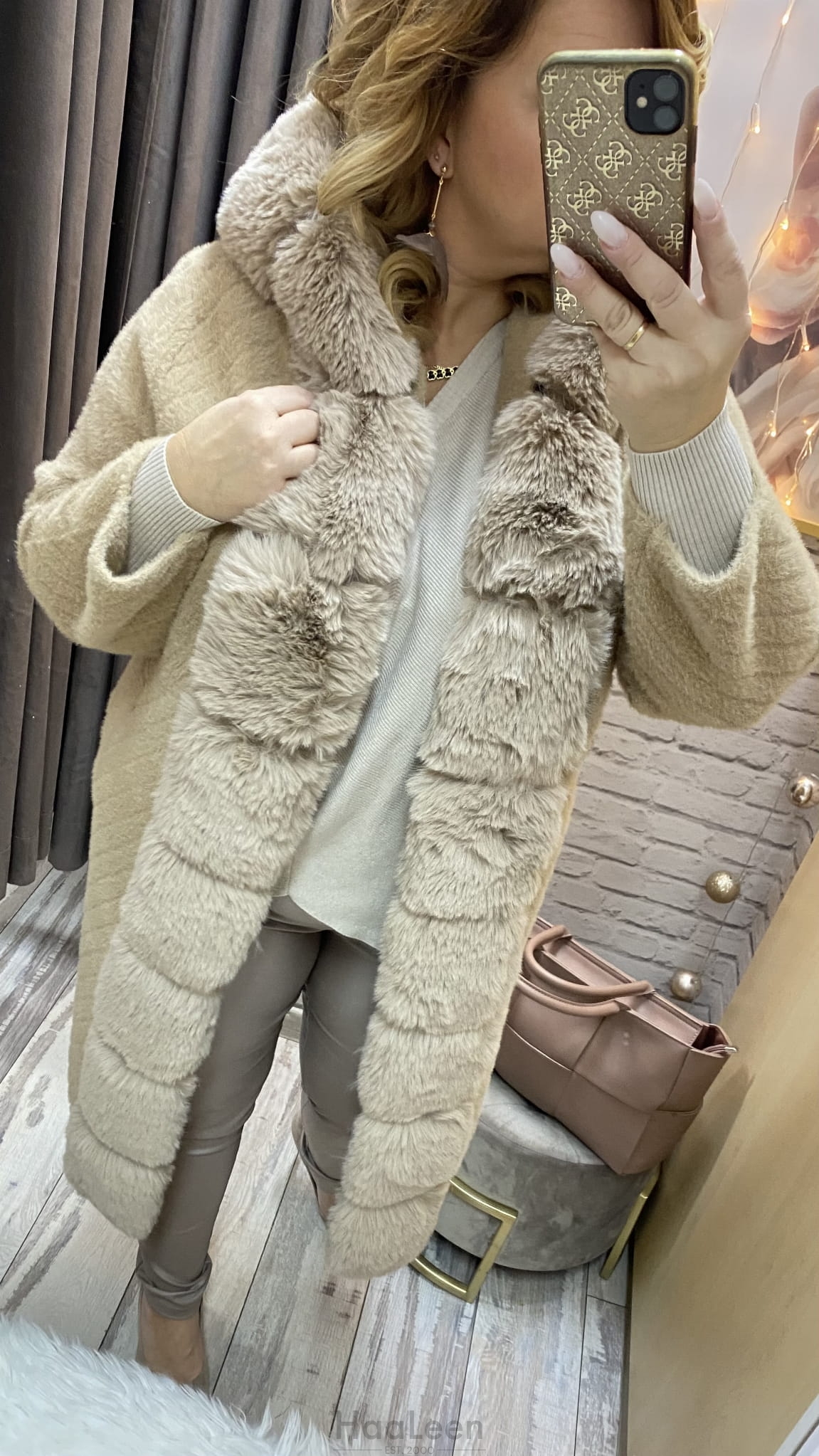 DŁUGOŚĆ: CIEPŁY LEKKI , kaptur, futerko na całej długości, do odpięcia, posiada 2 kieszenie, zapinany na haczyki