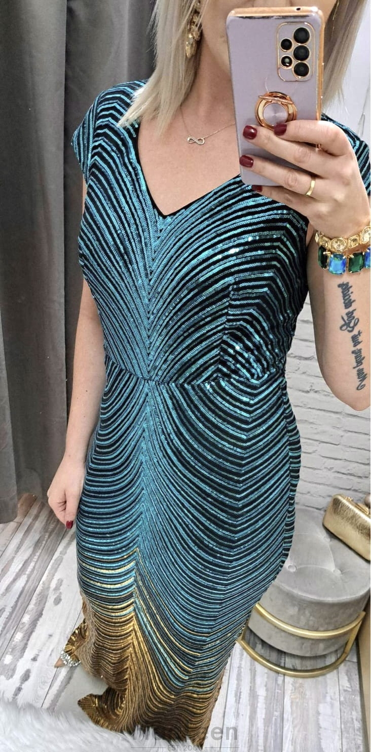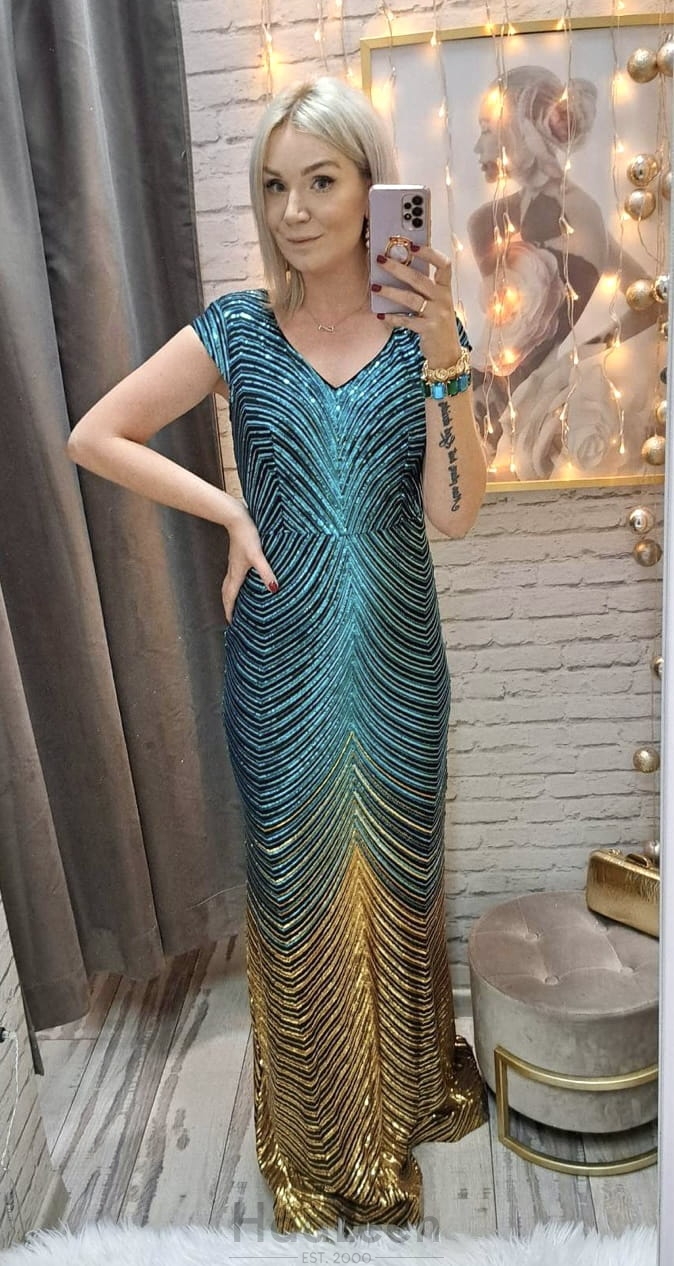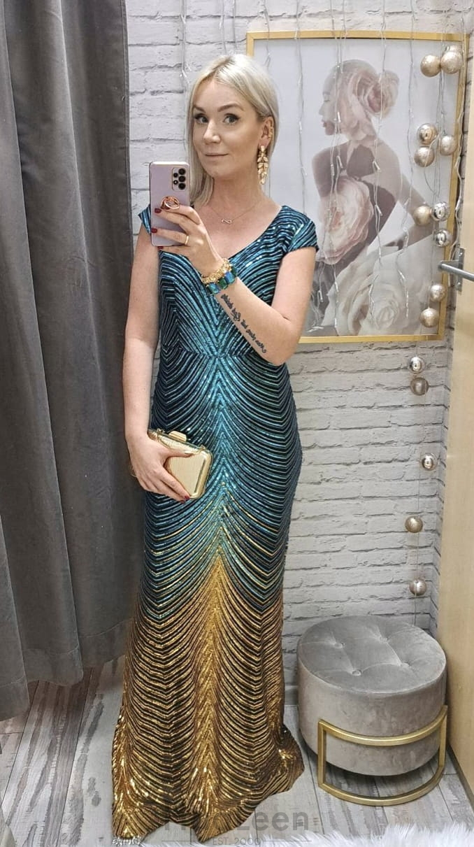 długość: maxi, efektowny dekolt V, subtelny dekolt plecy V, cekin tuszuje ,