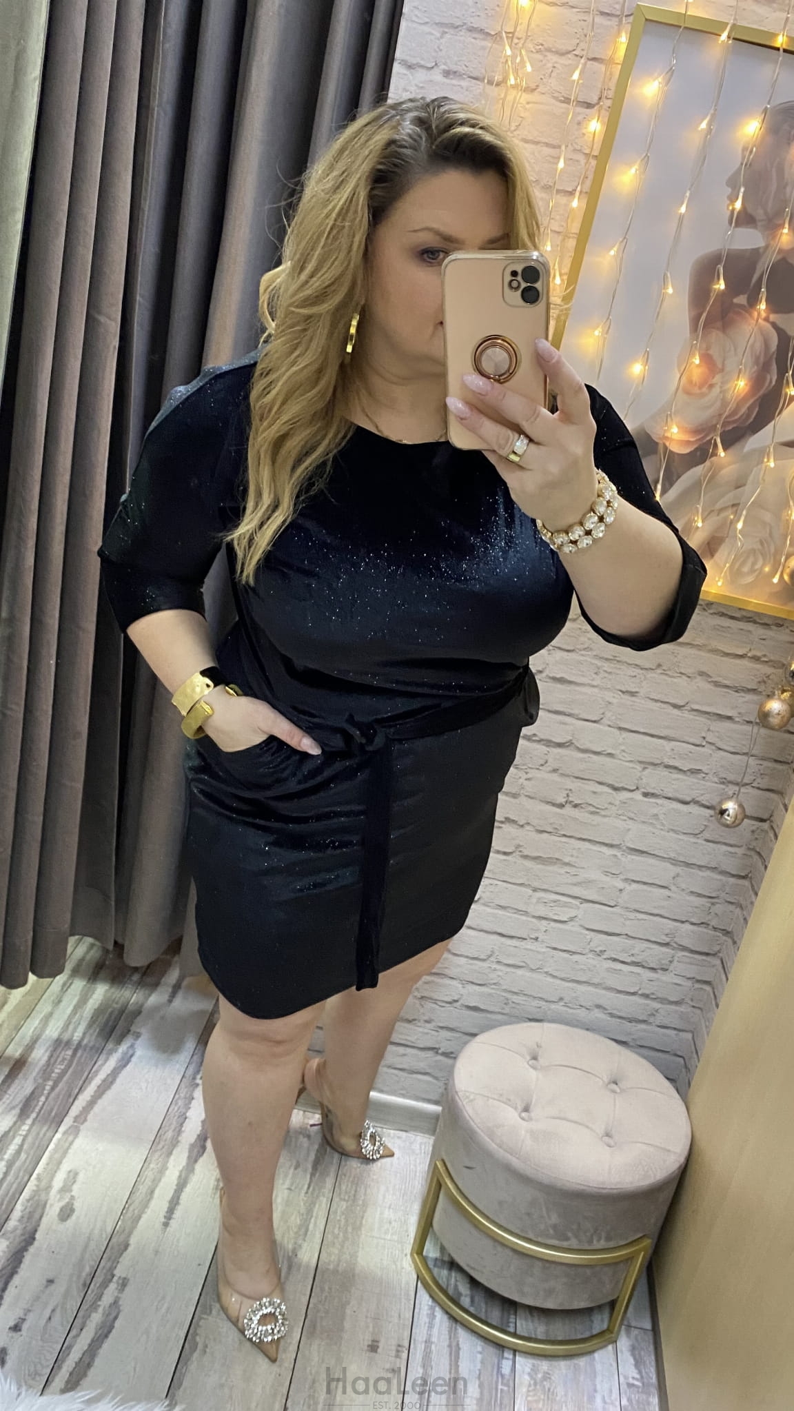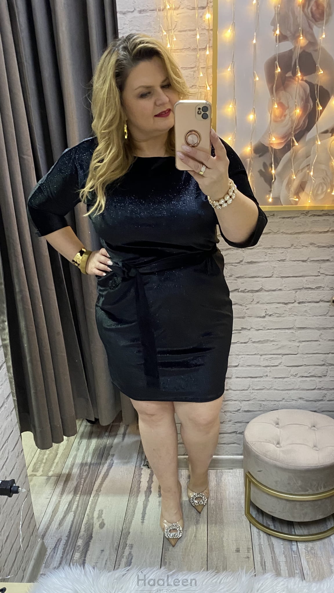 Sukienka luźna, rozciągliwa, dekolt łódka, zbluzowana przez gumkę w tali. tuszuje okolice biustu i tali , rękawki do łokcia , długość przed kolano