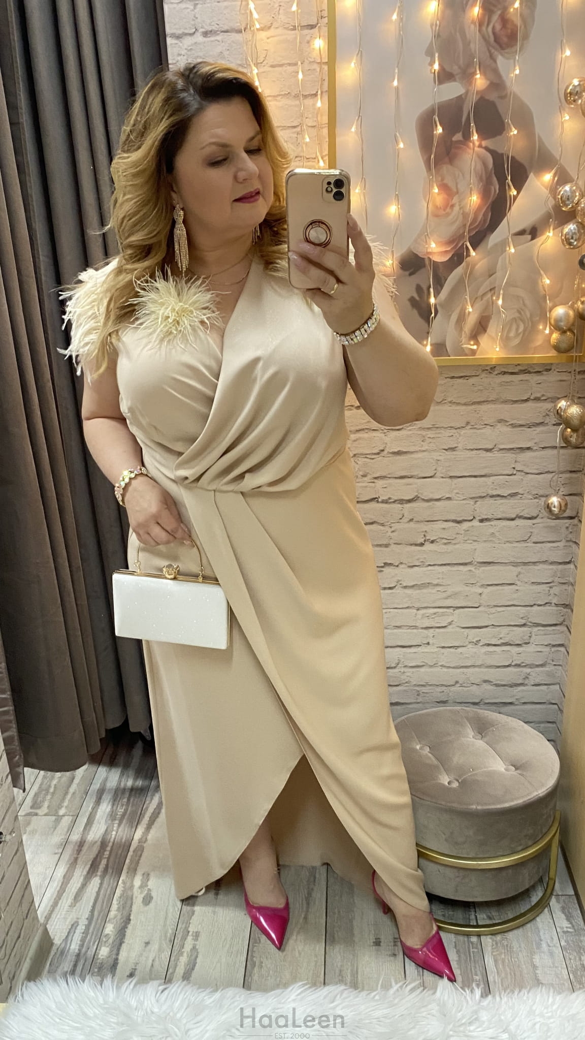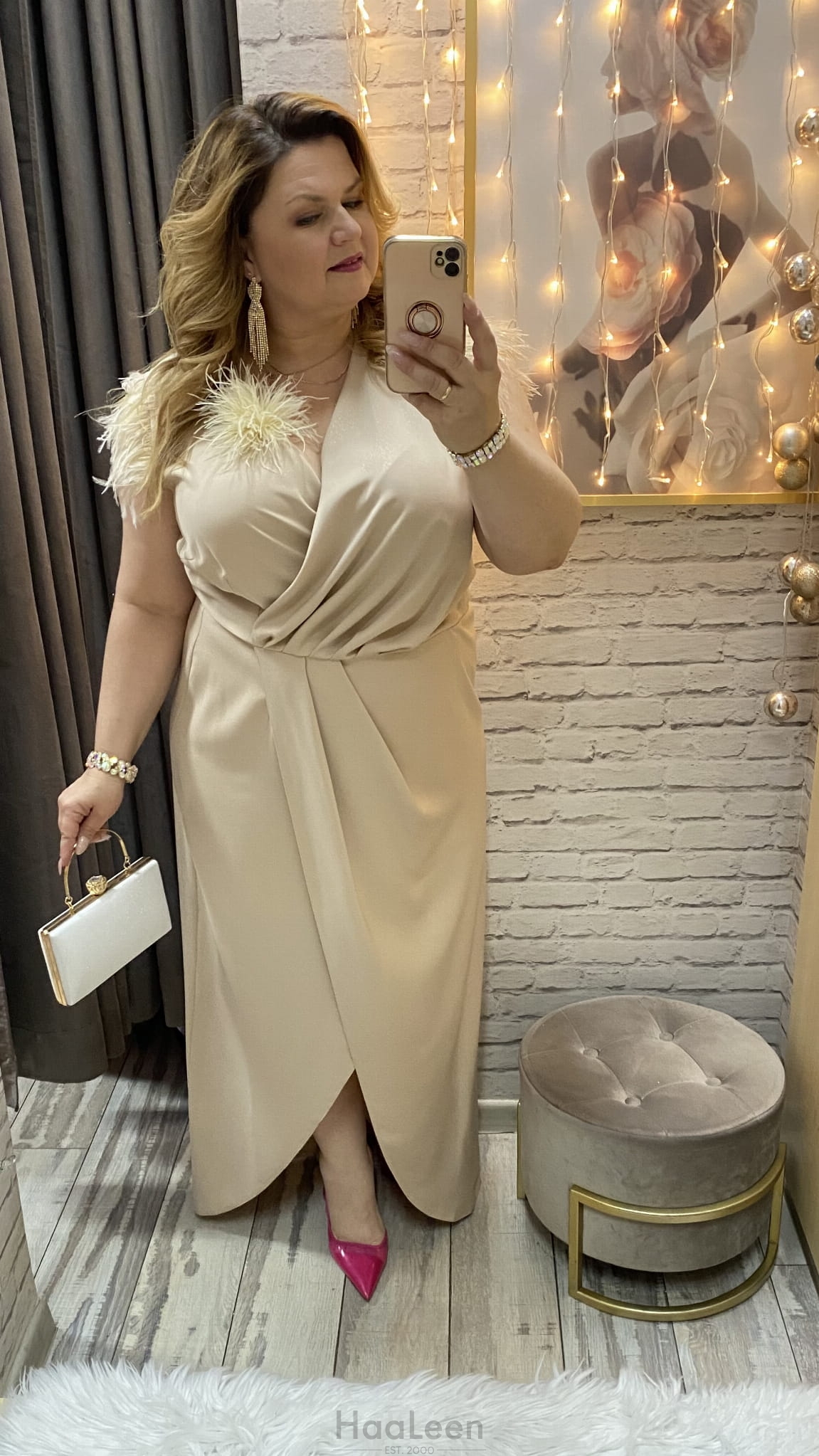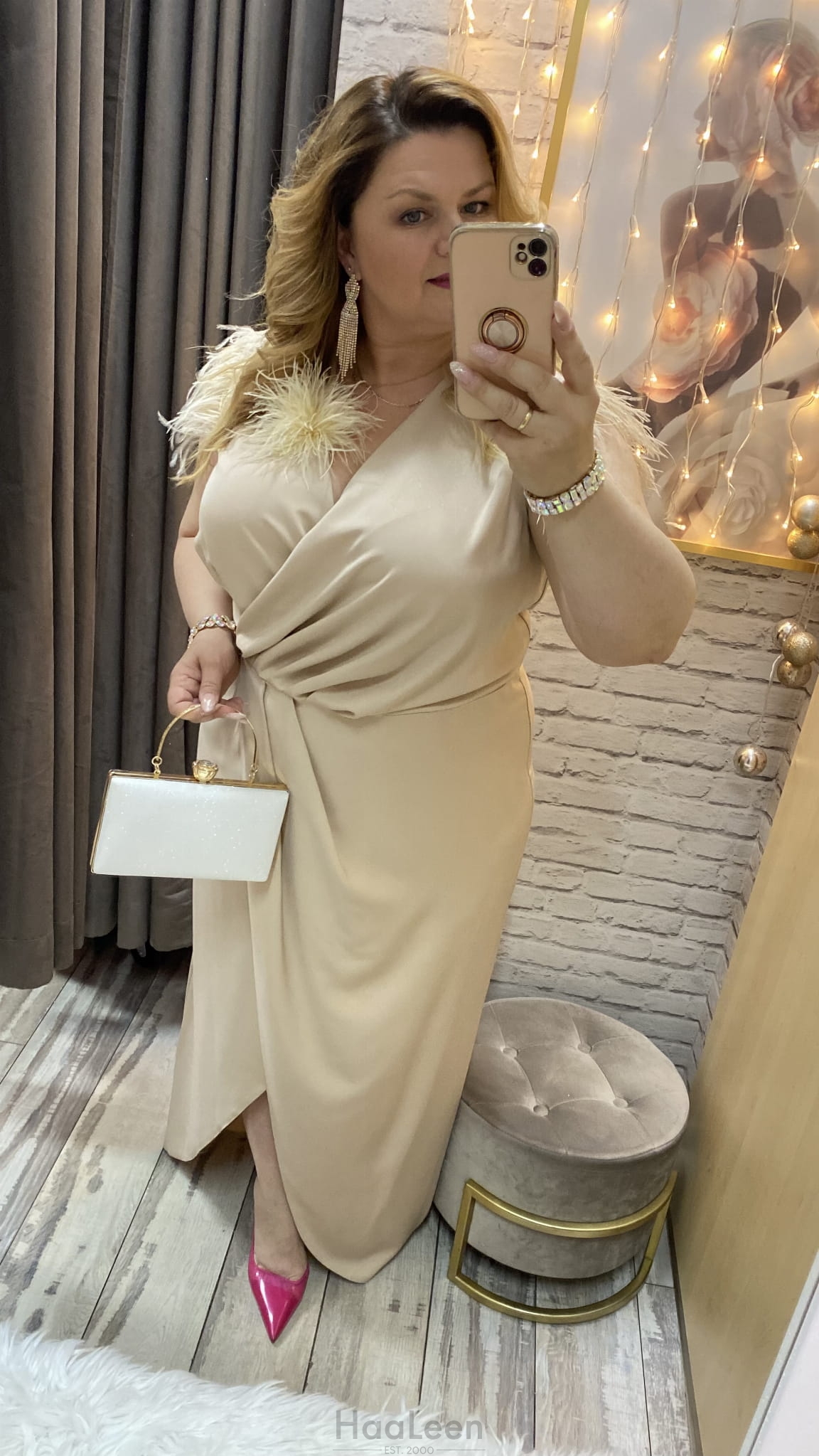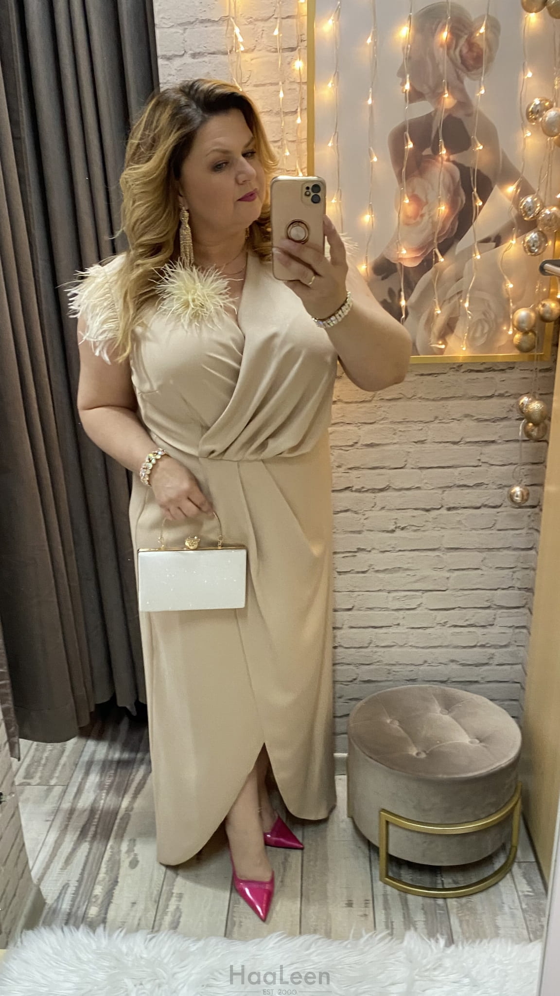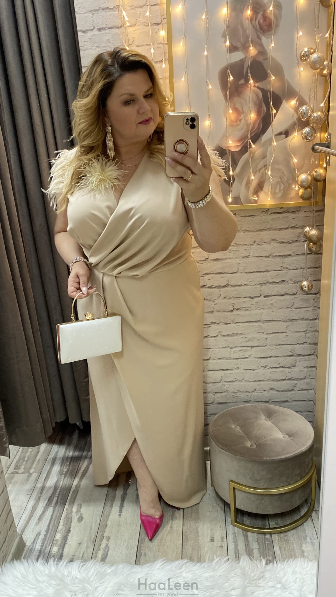 długość: maxi, efektowny dekolt zakładany V, dekolt plecy okrągły, zamek, ołówkowa dopasowana w biuście, tali, biodrach