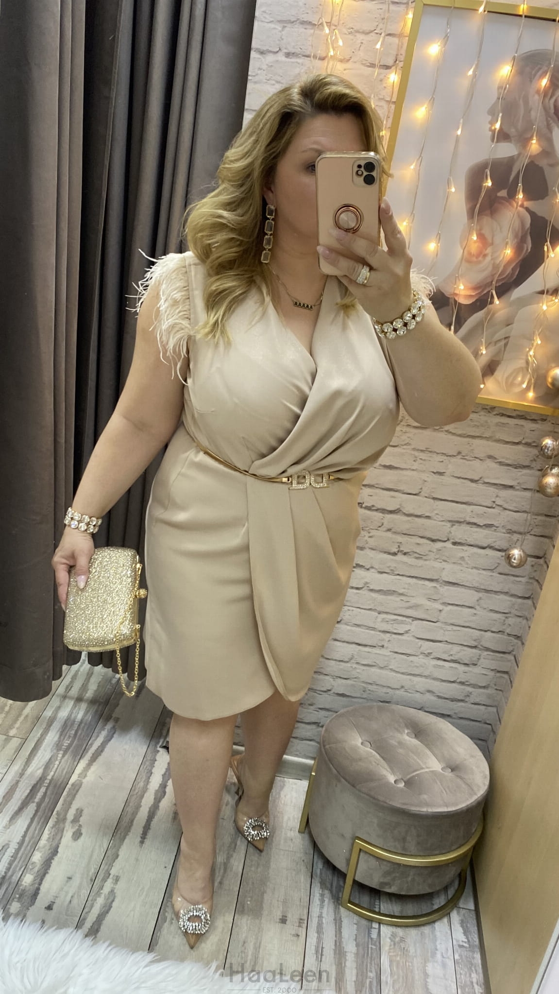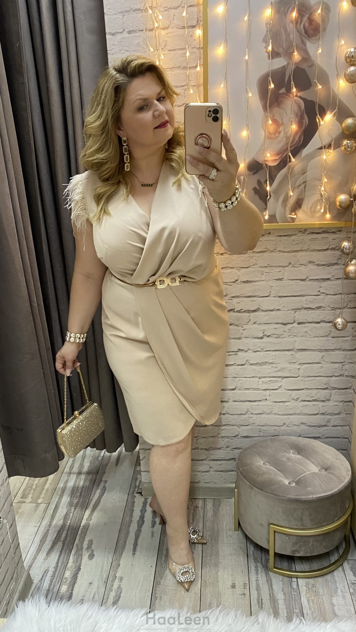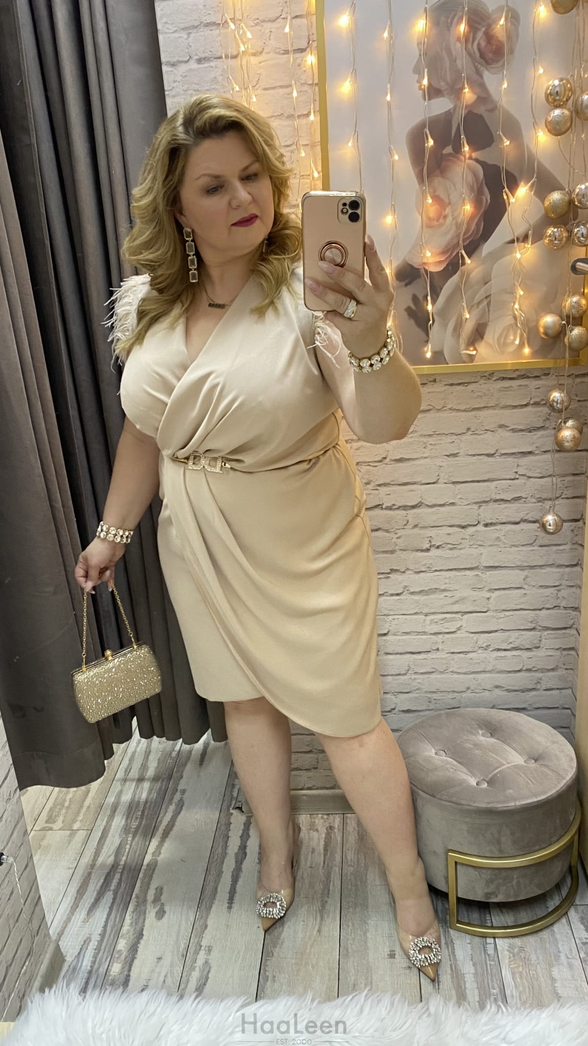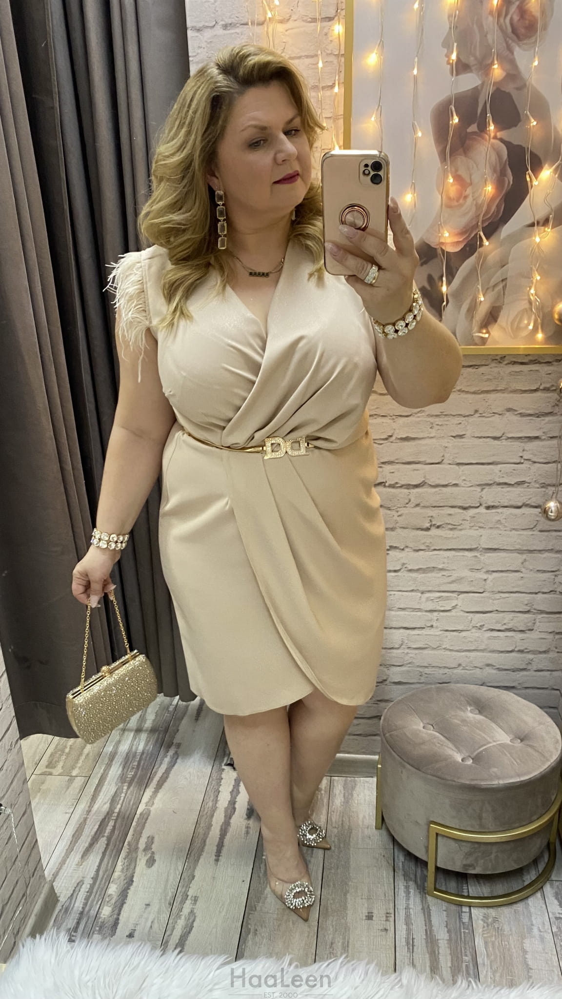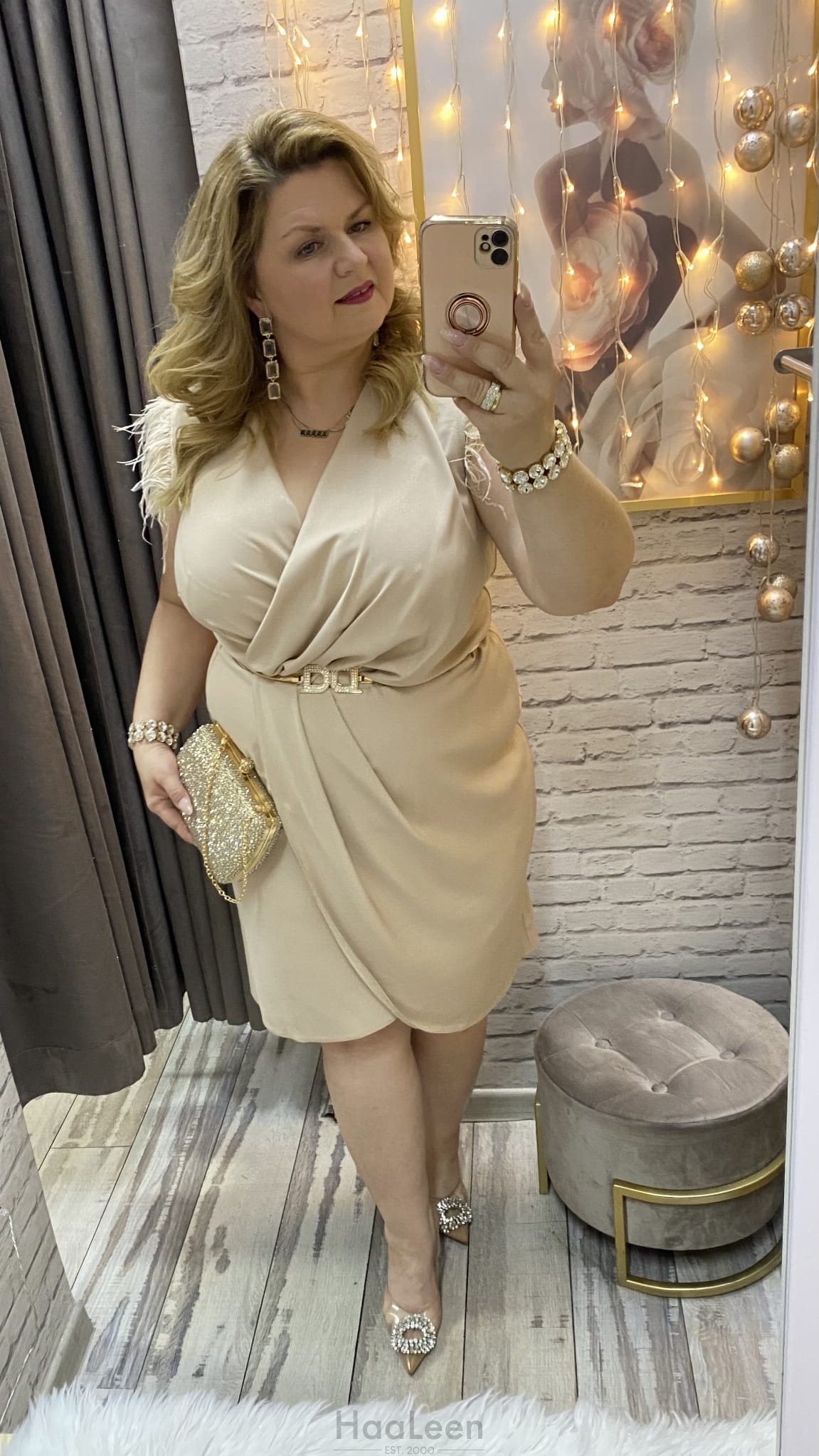 sukienka IRMINA 36-52 złota/beż połysk mini midi