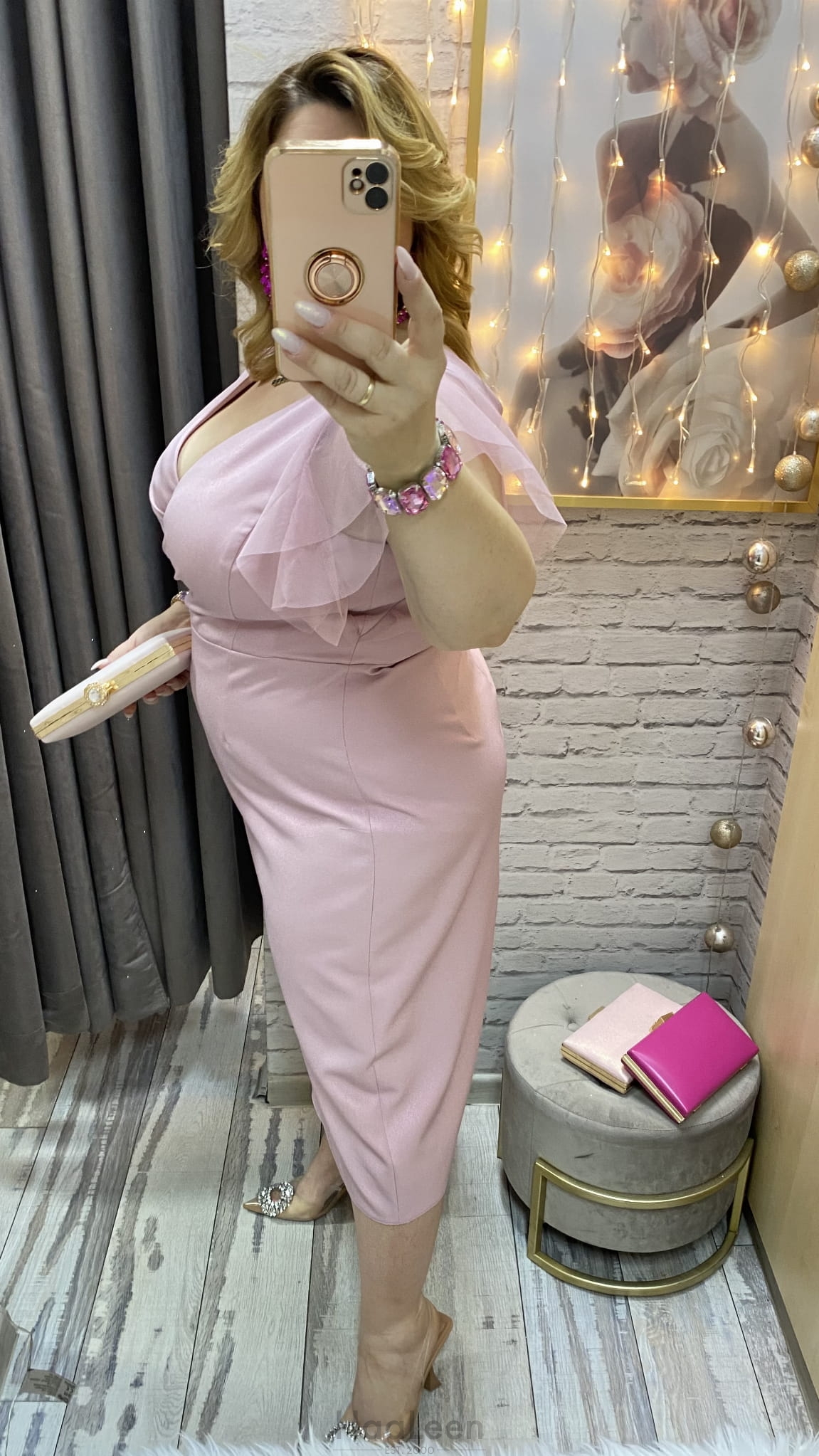 sukienka ołówkowa dopasowana, lekko poddaje się, z rozcięcie na lewej nodze, rekawek krótki tiulowy,